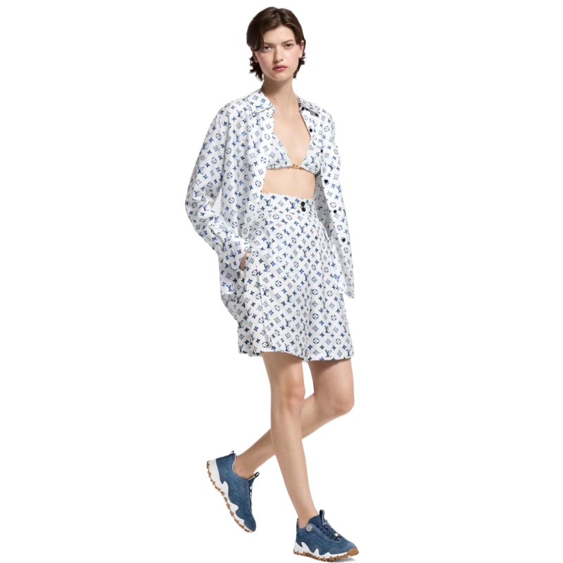 The sporty aesthetic of the LV Rush sneaker is complemented by a stylish combination of denim and Monogram-debossed suede calf leather. Designed by Women’s Artistic Director Nicolas Ghesquière, this model is characterized by its distinctive wave-shaped outsole. Other key details are the elastic laces, Louis Vuitton reflective loops and silver-toned LV Circle accessory on the side.