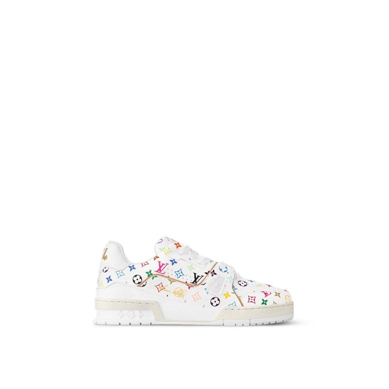 The iconic LV Trainer sneaker makes a fresh statement in grained calf leather featuring an allover print of a multicolored Monogram motif from the re-edition of the Louis Vuitton x Murakami collection, inspired by the artist’s exuberant aesthetic. Informed by vintage sporty styles, the upper is detailed with a cursive Louis Vuitton signature, while the back is printed with the number 54 in reference to 1854, the year the House was founded.