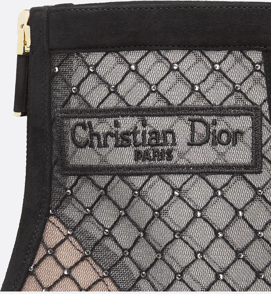 The Naughtily-D heeled ankle boot showcases streamlined, elegant lines. Offering a sophisticated interplay of transparency, the mesh style embroidered with silver-tone strass is embellished with the Christian Dior Paris signature and black suede goatskin detailing. The ankle boot is distinguished by its no-tongue design for an openwork effect. The 8-cm (3-inch) block heel and laces complete the delicate creation.