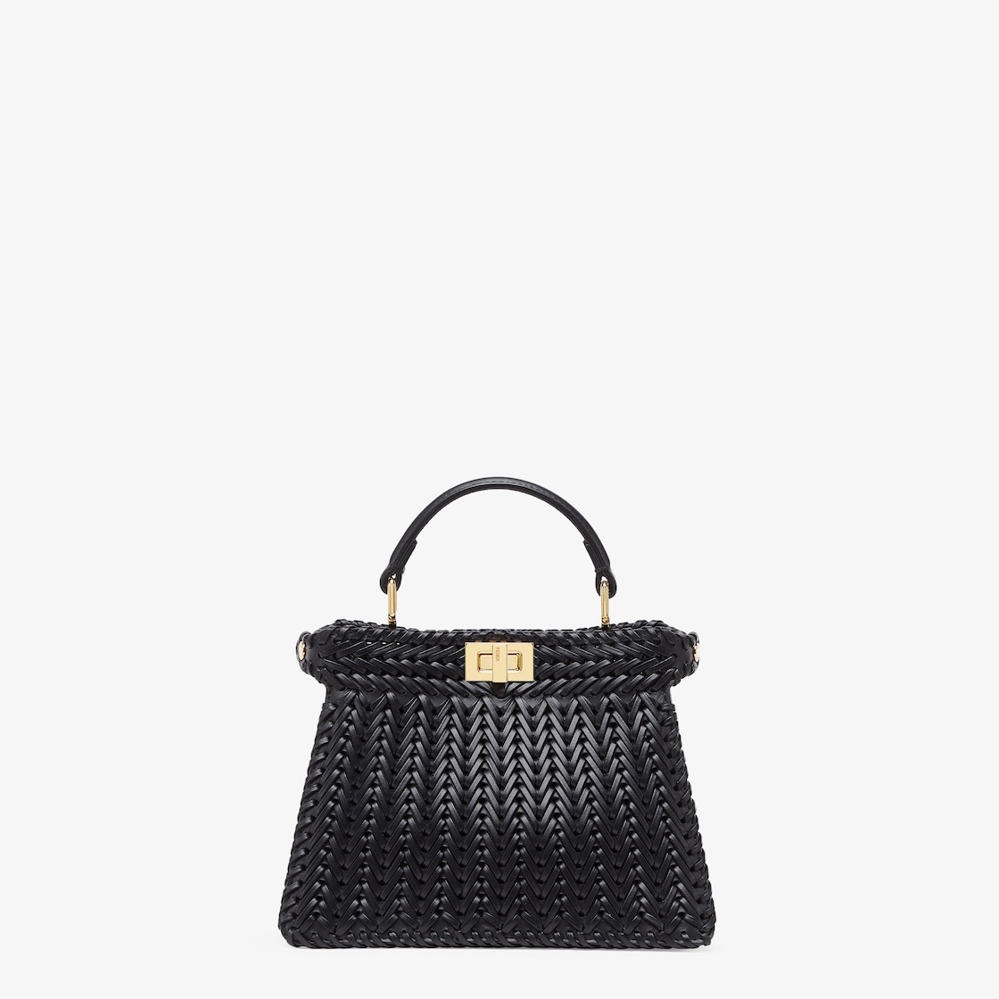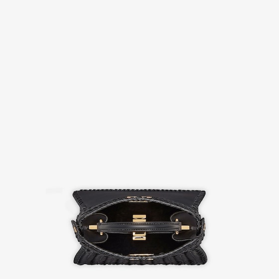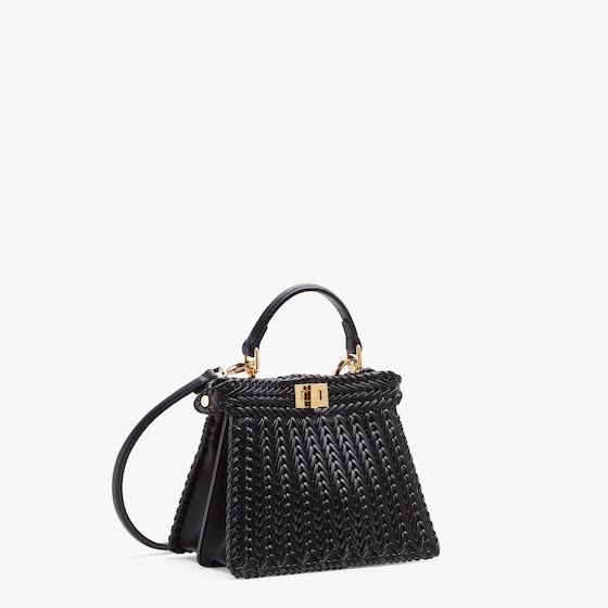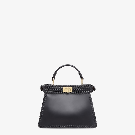 Iconic Peekaboo ISeeU bag in an ideal, compact size. Made of black leather with borders and front panel embellished by a hand-crafted tone-on-tone interlace. Decorated with the iconic twist lock on both sides.