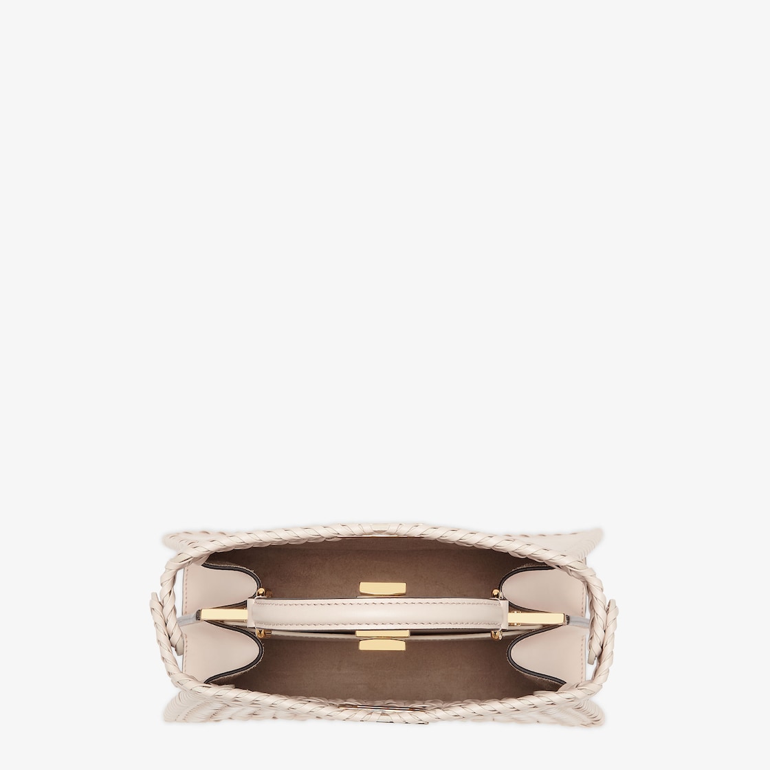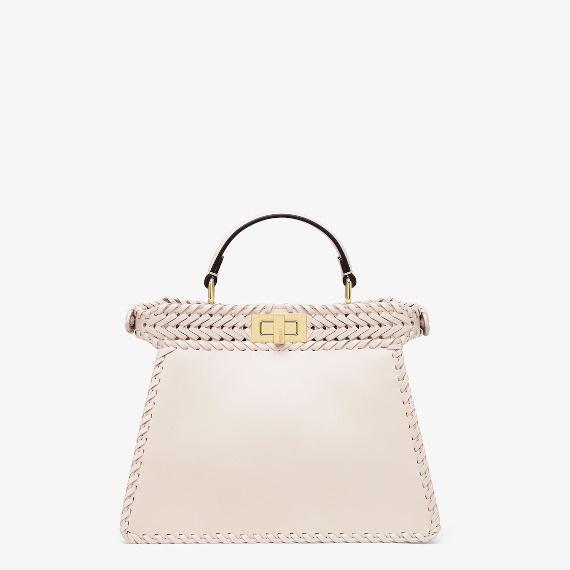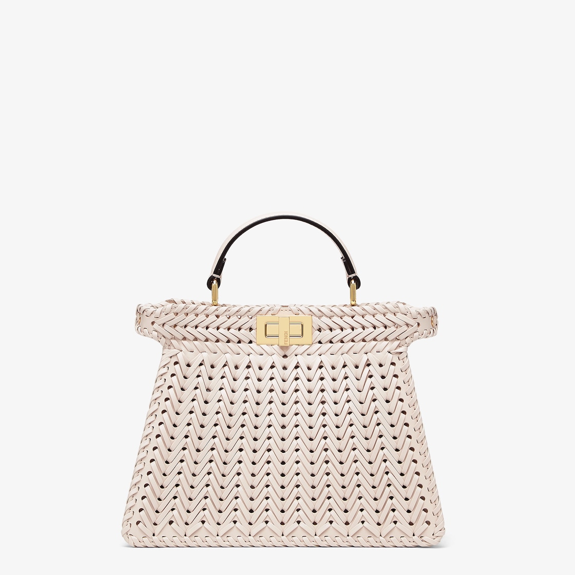 Iconic small Peekaboo ISeeU bag made of camellia leather with borders and front panel embellished with a tone-on-tone interlace. Decorated with the iconic twist lock on both sides.