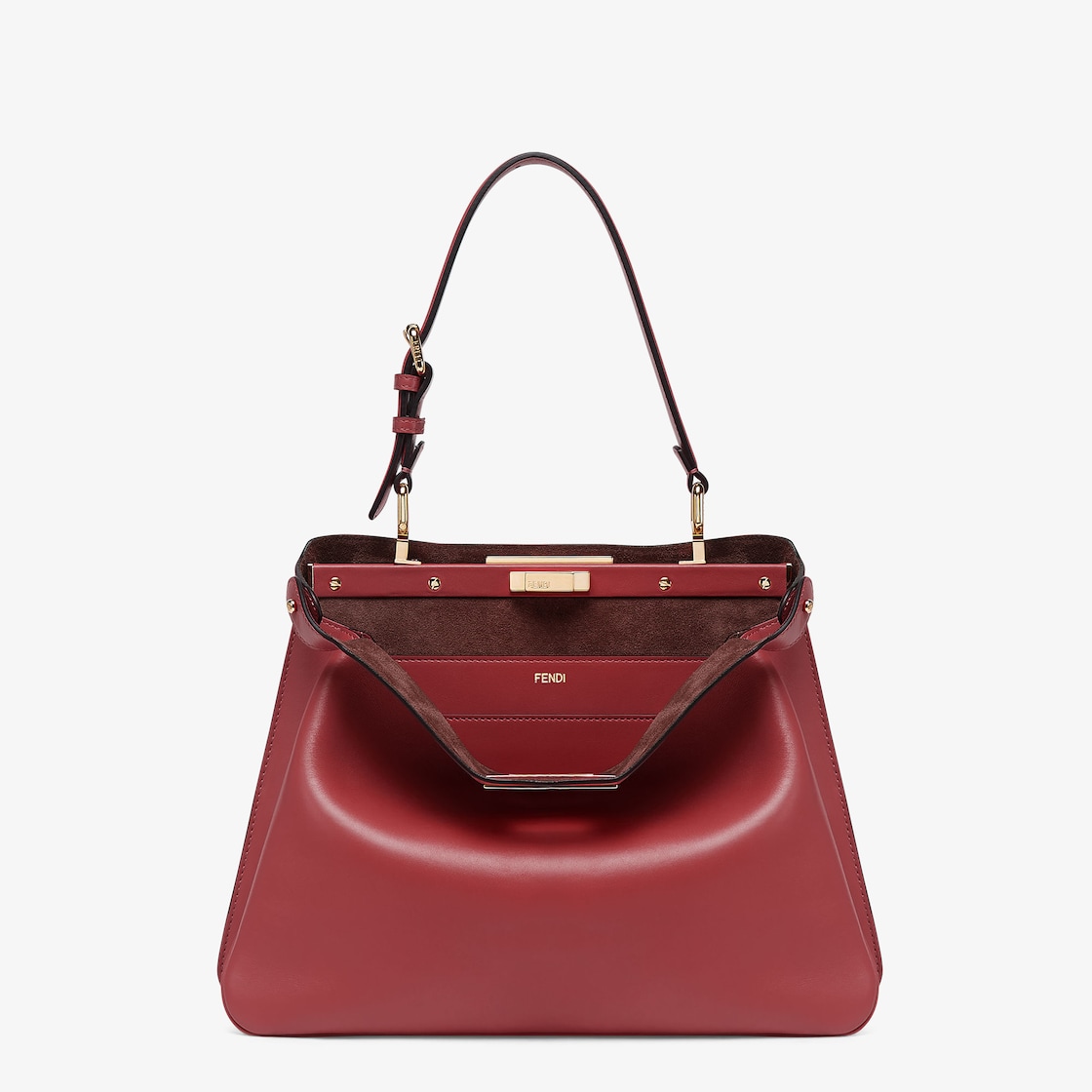 Featuring a suede-lined interior with two internal compartments divided by a stiff partition and a leather internal pocket with gold-colored FENDI logo print.