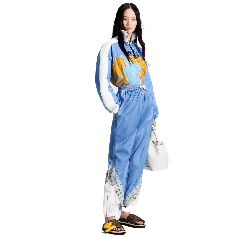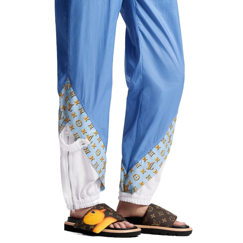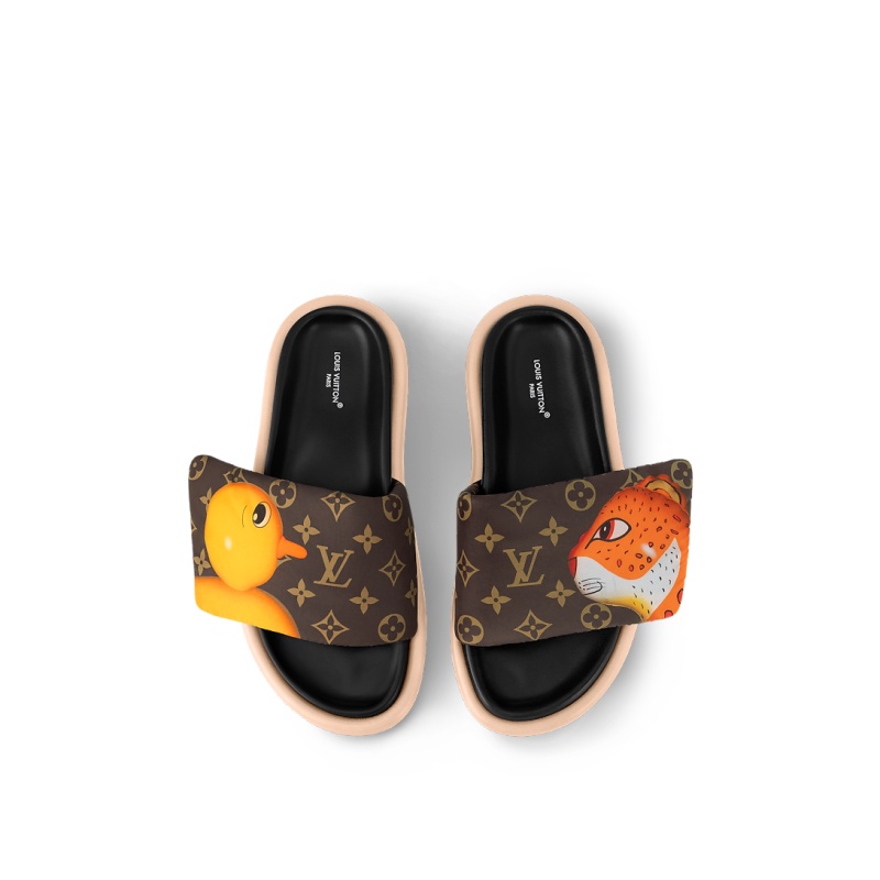 The Pool Pillow flat comfort mule in Monogram nylon is printed with colorful animal characters created by Chinese artist Sun Yitian for an exclusive collaboration with Louis Vuitton Artistic Director Nicolas Ghesquière. One of this model’s adjustable, padded straps features a chick and the other a leopard, reflecting the playful spirit of the collaboration.