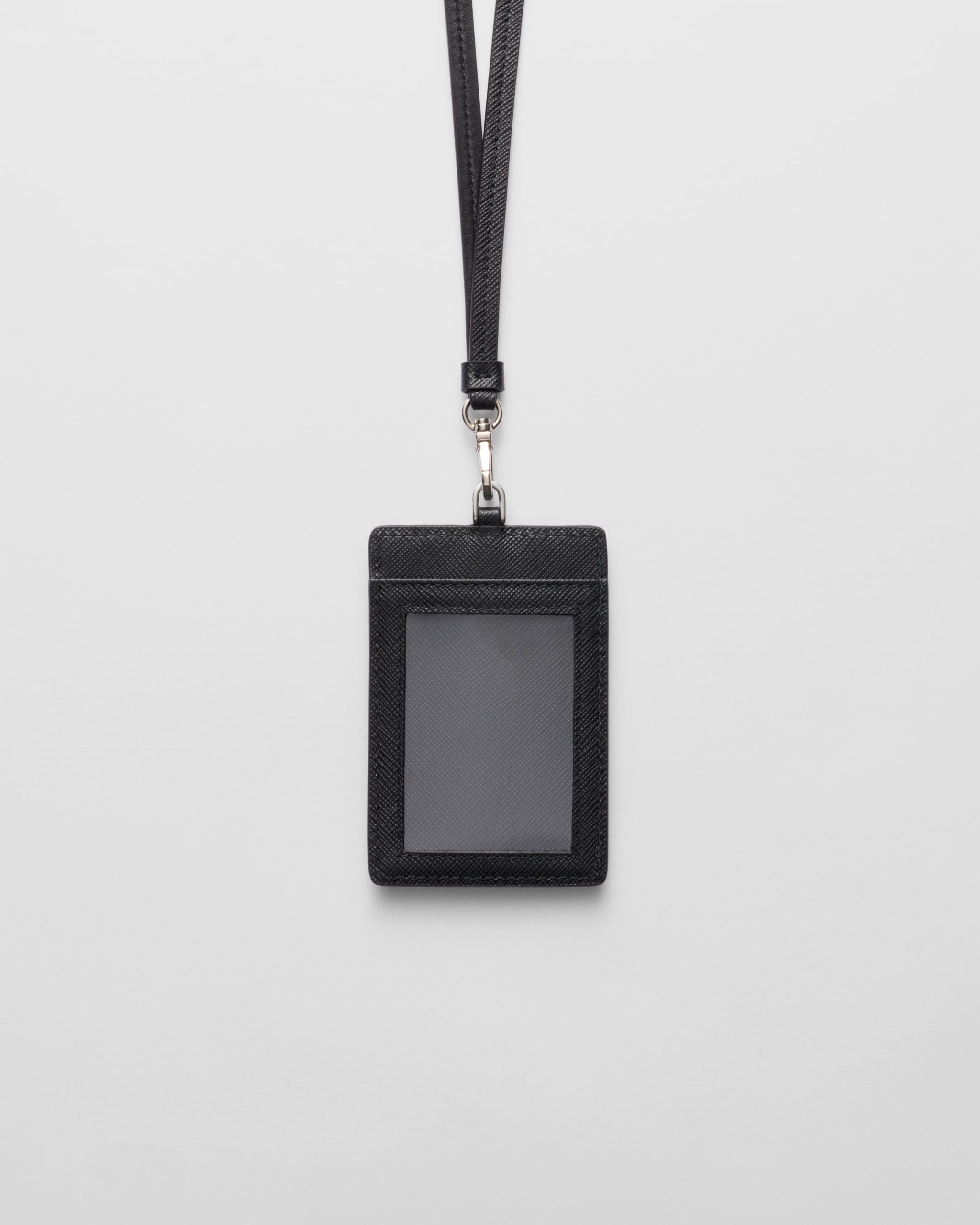 Elegant Saffiano leather badge holder with metal hardware and detachable strap.