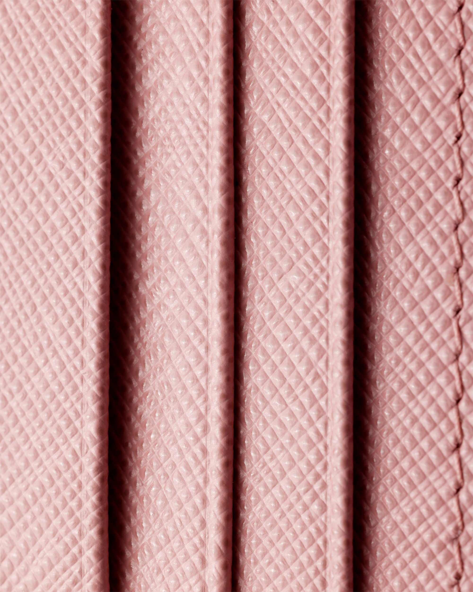 The unmistakable texture of Saffiano leather characterizes this sleek card holder. The accessory with six card slots is decorated with a tonal enameled metal triangle logo.