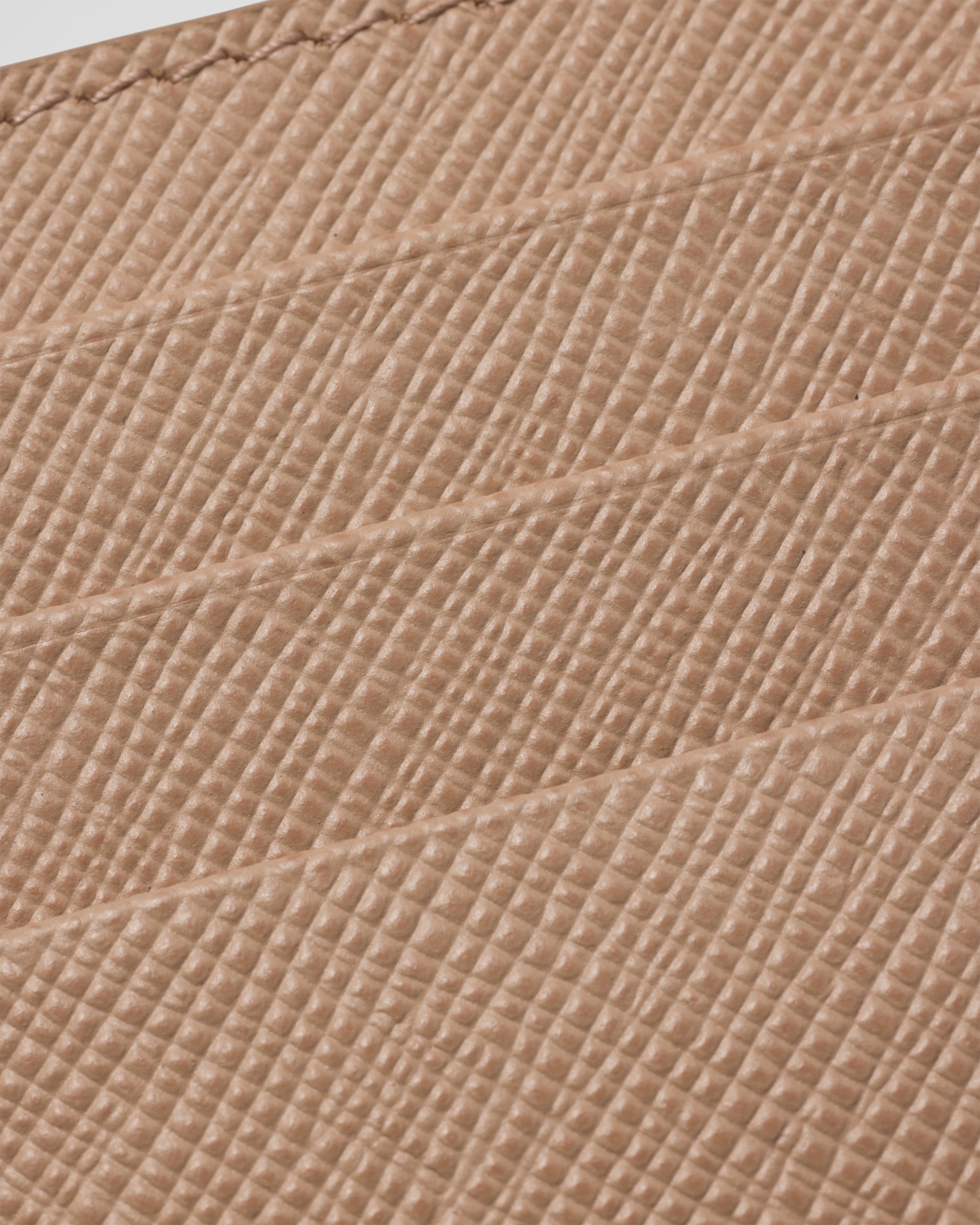 The unmistakable texture of Saffiano leather characterizes this sleek card holder. The accessory with six card slots is decorated with a tonal enameled metal triangle logo.