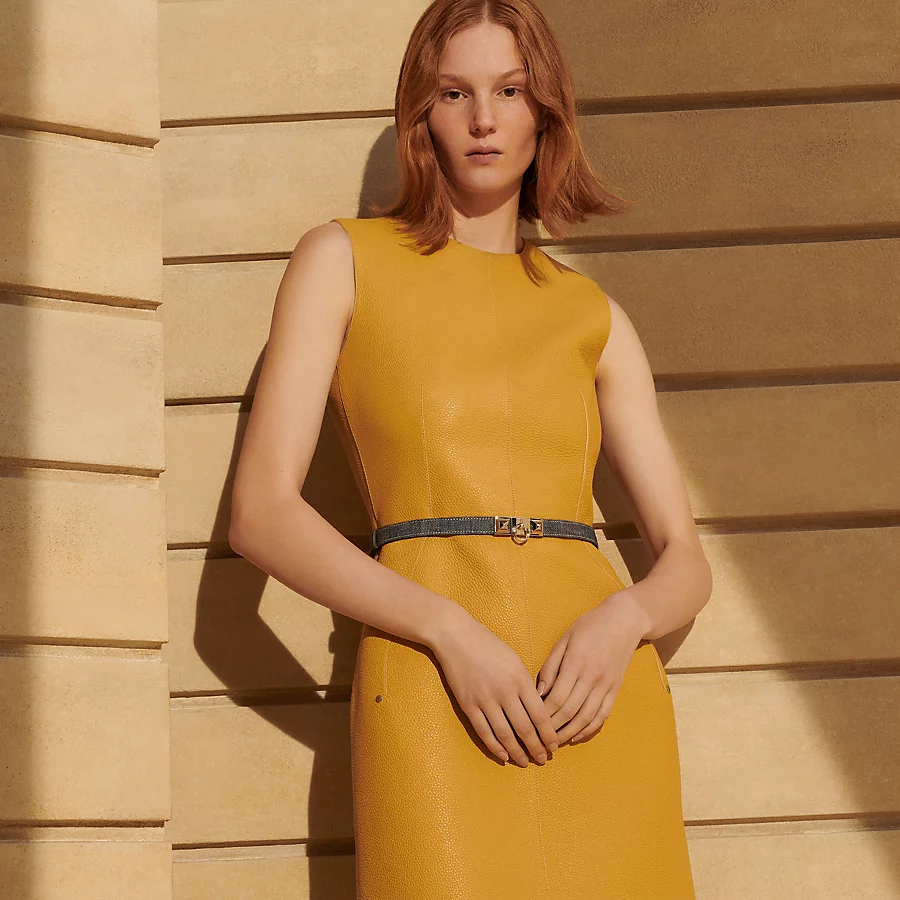 The Rivale buckle incorporates the iconic attributes of the legendary Collier de Chien with two Médor studs and a central ring. Thanks to a clever slide system, this adjustable belt can be worn at the waist or on the hips.