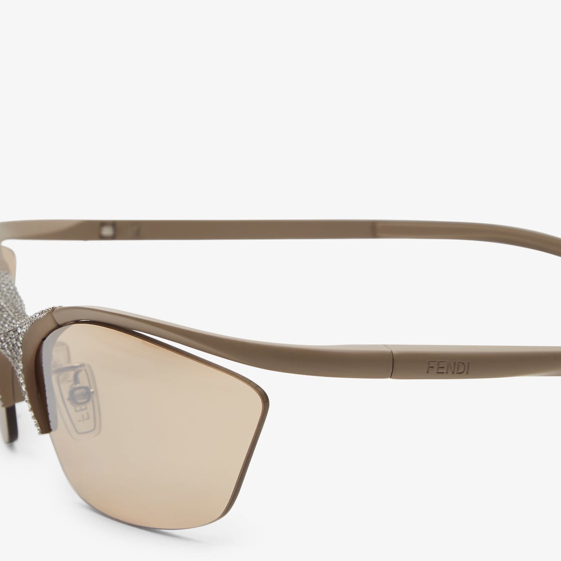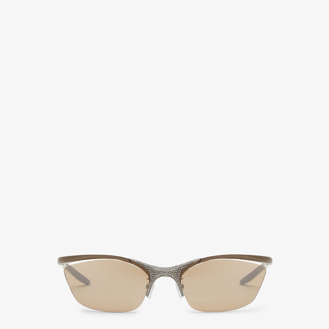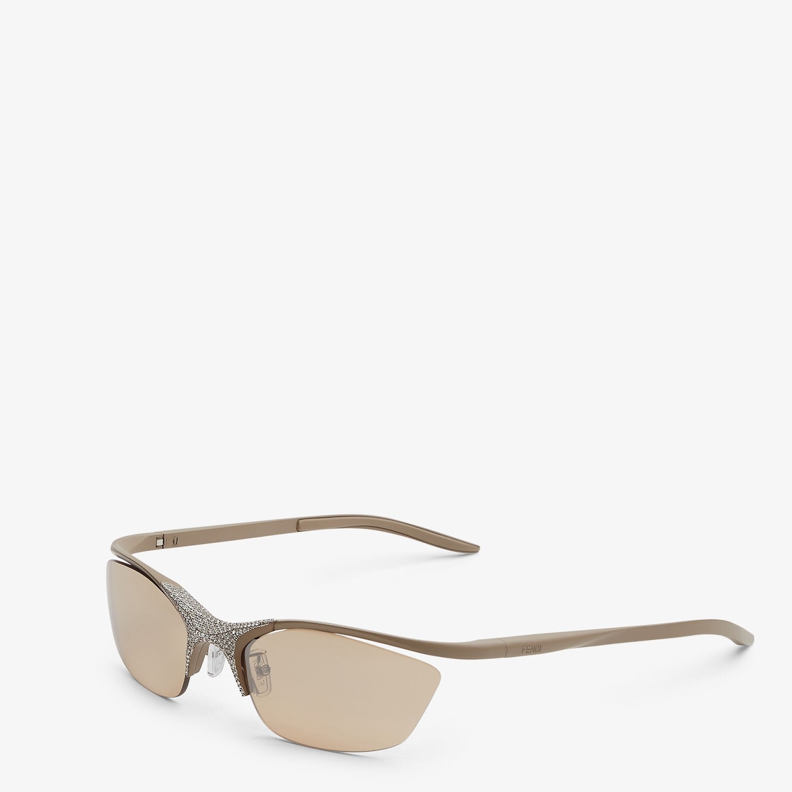 Semi-rimless shield Signature eyeglasses in taupe satin-finish aluminum. Bridge embellished with crystals. Beige suspended lenses with silver mirror effect. Adjustable nose pads with palladium-colored metal details.