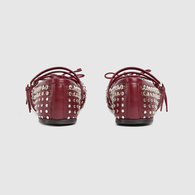 This iconic Horsebit ballet flat pays homage to the original ballet shoe silhouette defined by a squared tucked toe cap and the delicate bow detail. This style is crafted in Gucci Rosso Ancora red leather and defined by an allover studs detail. The “sacchetto” construction ensures a high level of comfort, thanks also to the soft padded insole.