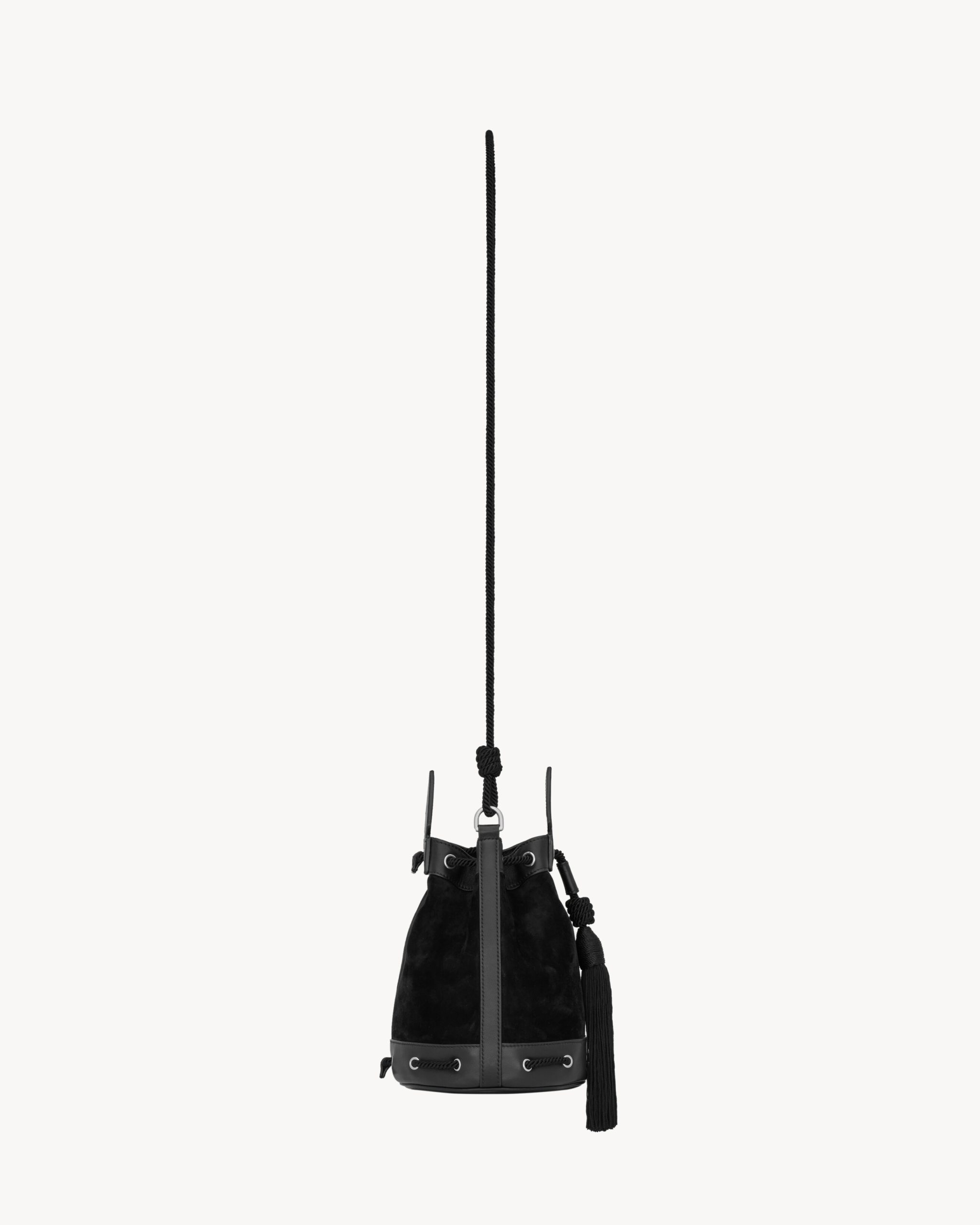 drawstring bucket bag in suede, decorated with a cord shoulder strap and tassel and embossed SAINT LAURENT signature.