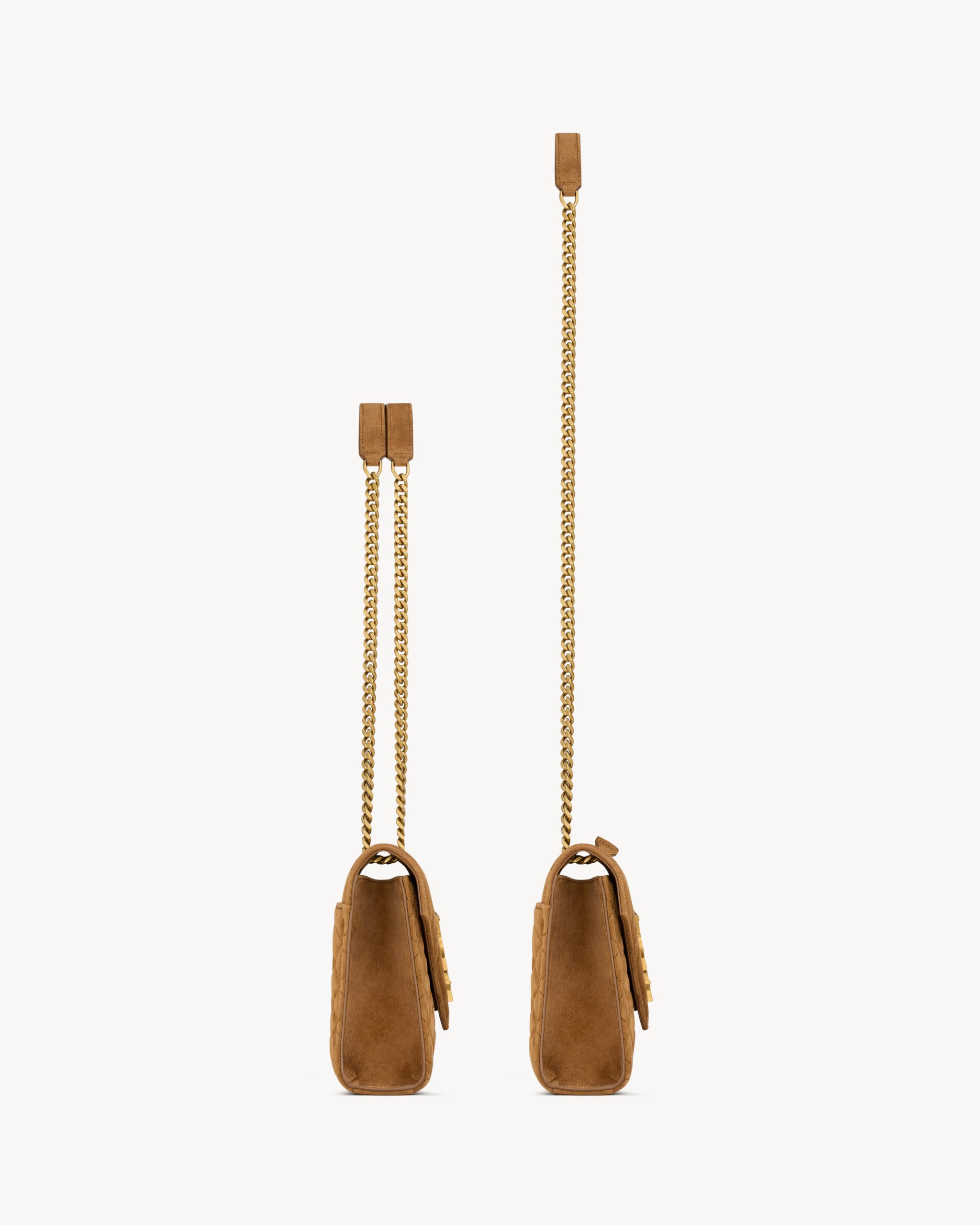 A timeless envelope bag in suede with vertical-, chevron-, and diamond-quilted topstitching.