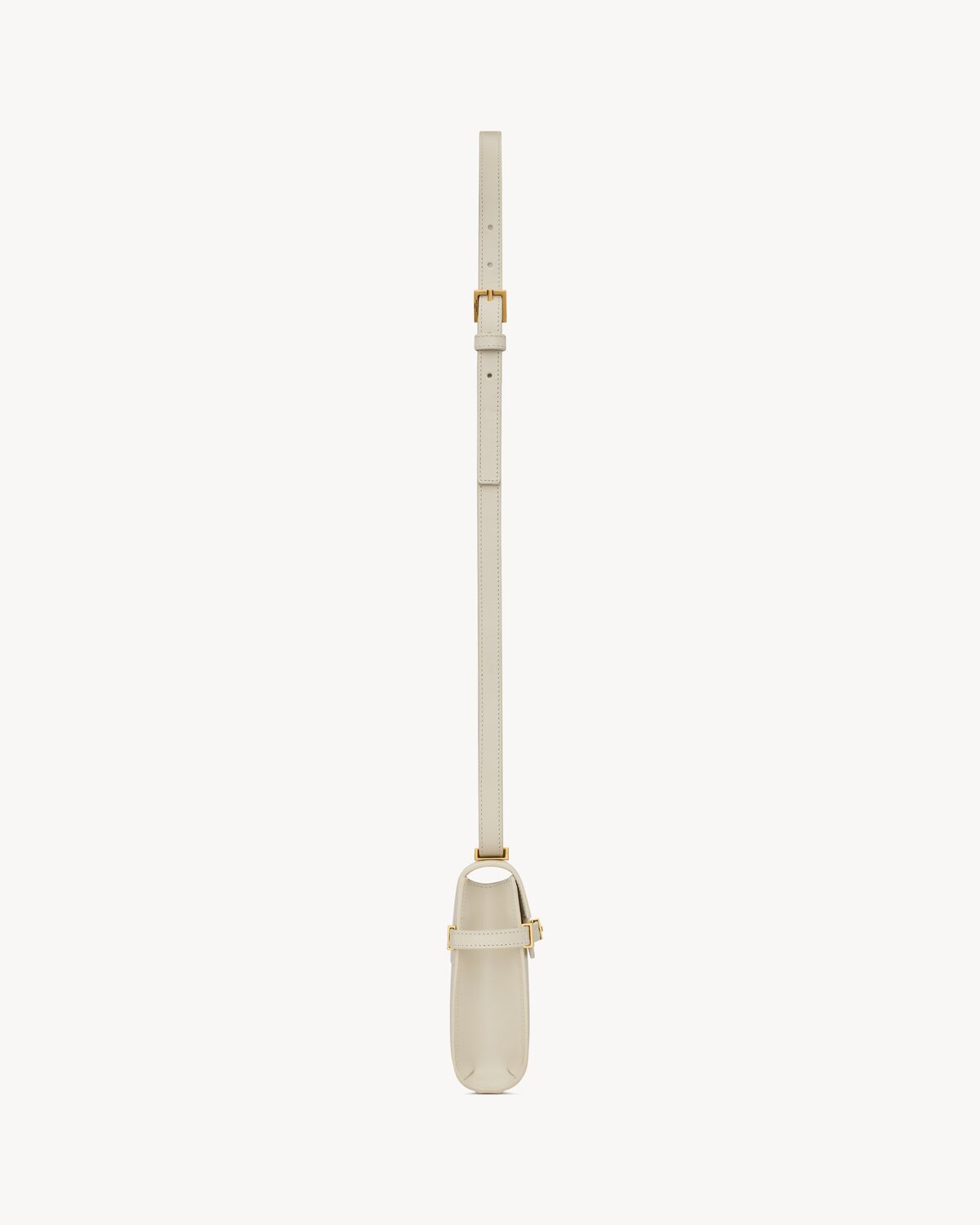 Mini bag with a small flap on top and compression tabs on the sides, featuring an adjustable strap.